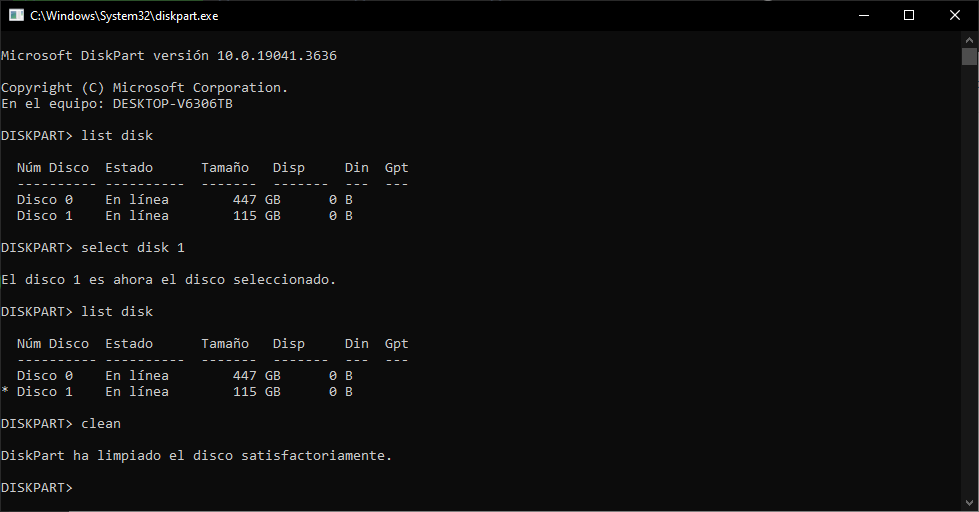 El número del disco puede variar dependiendo de qué número de disco le asigne Windows a nuestro USB, en este caso es 1, por lo tanto el comando sería “select disk 1”.