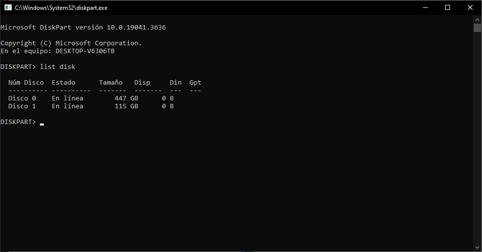Una vez abierto DiskPart ejecutaremos el siguiente comando:
